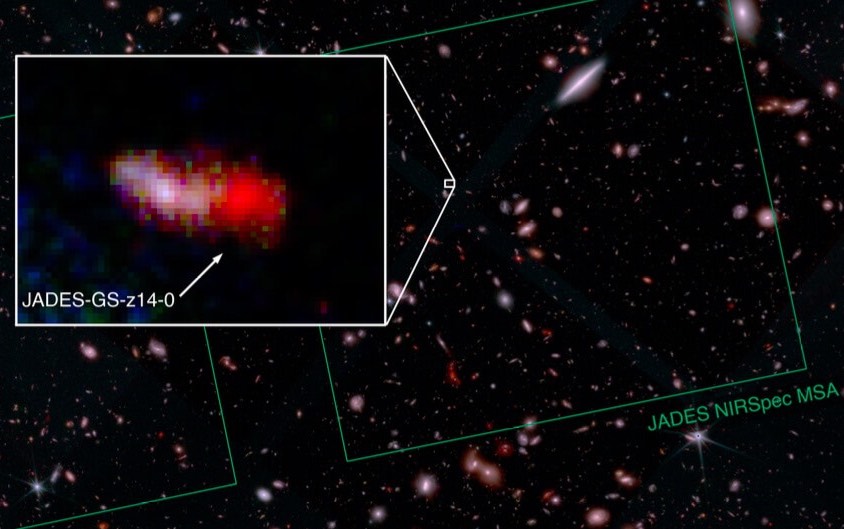 Image de la galaxie JADES-GS-z14-0 prise par le JWST. C’est l’analyse spectroscopique de sa lumière qui a permis une détermination de sa distance, en faisant l’objet le plus lointain jamais observé. (crédit : JWST/ESA/NASA/Collaboration JADES)