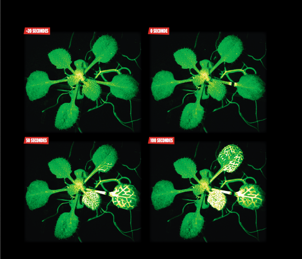 Grâce à des plantes transgéniques rendues fluorescentes, une équipe de biologistes du département de botanique de l'université du Wisconsin, aux États-Unis, a découvert comment une feuille blessée parvenait à transmettre le signal de l'attaque au reste de la plante.