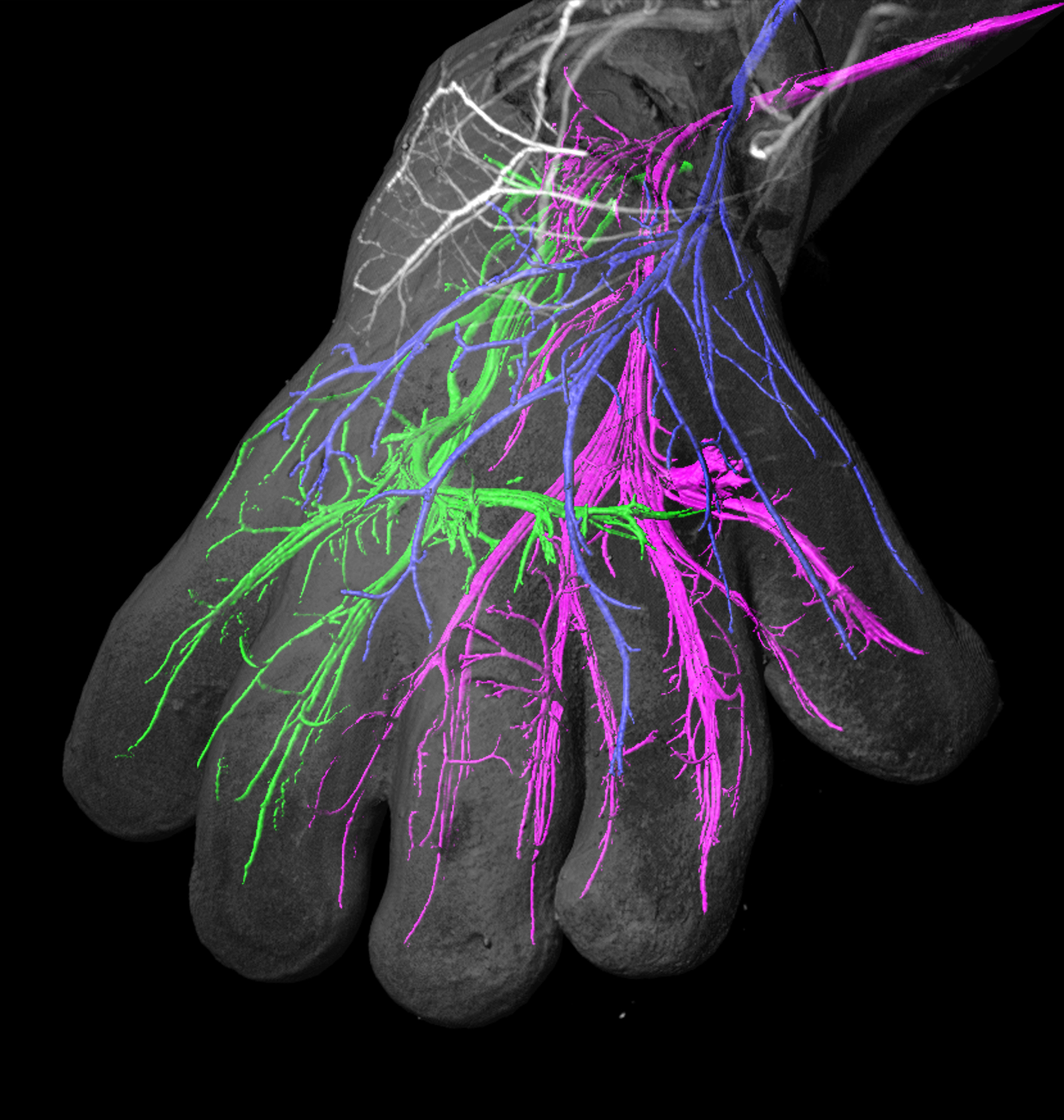 Sur cette main d’embryon humain, à 8 semaines de gestation, on observe pour la première fois le développement des trois nerfs sensitifs ulnaire (en vert), médian (en rose), radial (en bleu). On peut ainsi constater que l'innervation de la peau se développe avant la fin du premier trimestre.