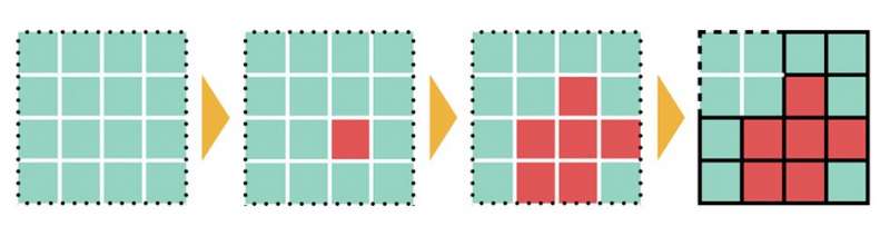 Le territoire est initialement morcelé en des zones de petite taille, des cellules d’entre 10 000 et 100 000 habitants. Chaque cellule est marquée verte ou rouge selon que le virus y est maîtrisé ou non. Chaque jour, chacune des cellules vertes peut potentiellement devenir rouge ; nous supposons que cela arrive avec une probabilité proportionnelle au nombre total de personnes infectées dans le pays. Il s’agit donc d’un phénomène global. Aussi, lors d’un nouveau marquage rouge au sein d’une zone verte, nous supposons que ce marquage se propage à l’intérieur de la zone, ce qui en revanche est un phénomène local. Enfin, nous supposons que le marquage rouge dure un nombre aléatoire de jours, entre 14 et 35. Tandis que les cellules rouges restent isolées, les cellules vertes sont progressivement fusionnées pour former des zones vertes plus vastes. Aussi bien la couleur des cellules que le nombre de zones vertes évoluent au cours du temps. La lutte contre le virus est terminée à partir du moment où toutes les cellules se rejoignent en une seule zone verte.
