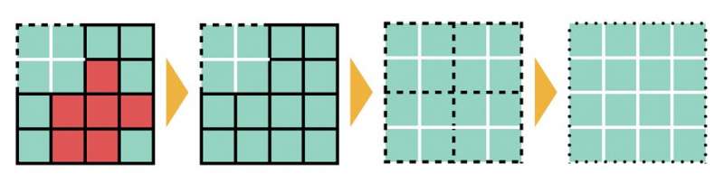 Sur les figures ci-dessous, nous utilisons une partition simplifiée d’un territoire en 4x4 cellules et trois niveaux de taille pour les zones vertes : 1x1, 2x2 et 4x4.