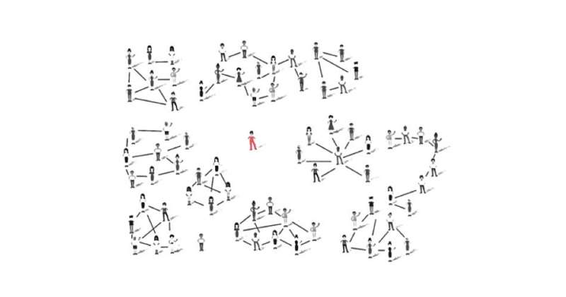 Les confinements varient en intensité. Par exemple, en France, chaque personne doit rester à moins d’un kilomètre de chez soi, tandis qu’en Inde règne une totale interdiction de sortir de son domicile. De plus, il est actuellement quasiment impossible de voyager d’un pays européen à l’autre. Ces pays sont de fait des sous-réseaux déconnectés les uns des autres au sein du réseau de proximité physique (voir la figure ci-dessous).