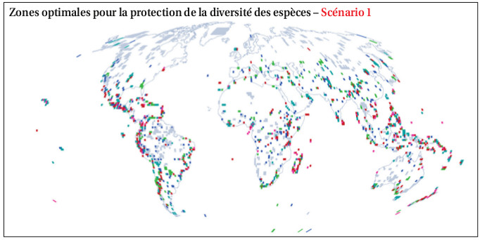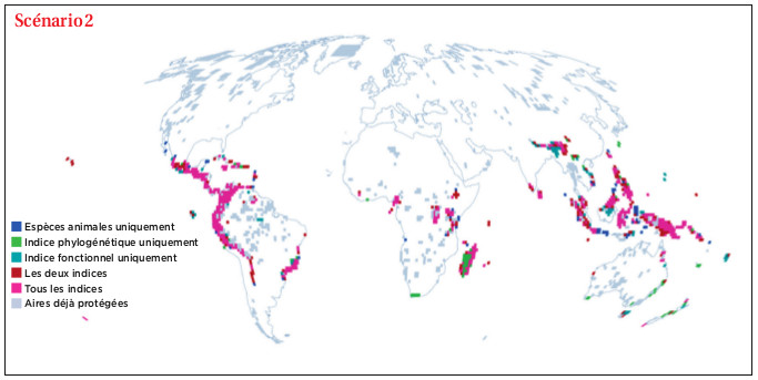 Ces cartes, établies par le laboratoire d'écologie alpine de Grenoble, montrent les zones prioritaires dans le cadre de l'expansion de 5% des superficies des aires protégées dans le monde au profit de différents types de diversité, pour les oiseaux et les mammifères. Si ces zones étaient protégées, la diversité totale sauvegardée pourrait presque tripler par rapport à la situation actuelle. Chaque carte montre un scénario choisi : le scénario 1 vise à protéger toute la biodiversité rare ; la seconde carte indique les zones maximisant la diversité totale protégée (le nombre d'espèces protégées globalement), au détriment des espèces rares. © L. Pollock/W. Thuillier