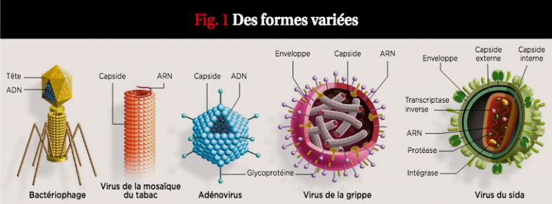 On en eut une idée en 1939, grâce au microscope électronique que venait d'inventer le physicien allemand Ernst Ruska. Son frère Helmut, médecin, put alors observer l'agent de la mosaïque du tabac : il ressemblait à un bâtonnet. En 1958, la cristallographe Rosalind Franklin postula que ce dernier était creux. Et en effet, il renferme en son centre une molécule d'ARN. L'étude de beaucoup d'autres virus a montré qu'ils possèdent tous une coque protéique, ou capside, dont la composition est caractéristique de chaque virus, de même que l'agencement des protéines qui la constituent. In fine, les capsides peuvent avoir une forme de bâtonnet, ou encore d'icosaèdre (polyèdres à vingt faces). La forme la plus surprenante est celle des virus de bactéries, les bactériophages (Fig. 1). Le génome viral, lui, est constitué d'ADN ou d'ARN, simple-brin ou double-brin, linéaire ou circulaire. Il code les protéines de la capside ainsi que des enzymes nécessaires à la réplication du génome. Par ailleurs, nombre de virus possèdent, autour de leur coque, une enveloppe composée de lipides, et hérissée de protéines et de glucides servant aux virus à se fixer aux cellules qu'ils infectent.