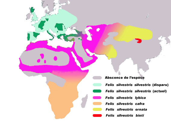 En étudiant l’ADN mitochondrial (*), nous pouvons remonter la lignée maternelle et suivre un marqueur génétique de l’évolution des populations. Cela a permis d’associer, il y a une dizaine d’années, les lignées mitochondriales aux 5 sous-espèces de chats sauvages : Felis silvestris silvestris, le chat sauvage européen, Felix silvestris lybica, le chat sauvage vivant dans la moitié nord de l’Afrique (du Maghreb au Kenya) et jusqu’en Asie du sud-ouest, Felis silvestris ornata, en Asie, Felis silvestris cafra, présent dans le sud de l’Afrique, et enfin Felis silvestris bieti, originaire du Tibet. Ils ont tous une signature génétique caractéristique, et vivent dans des zones géographiques précises. Or l’étude du génome mitochondrial du chat domestique moderne révèle essentiellement la présence de la signature du lybica, ainsi que, dans une moindre mesure, celle du chat européen (cette dernière s’expliquant par le fait que le chat domestique se reproduit naturellement, lorsqu’il vit en liberté, avec le chat sauvage européen).