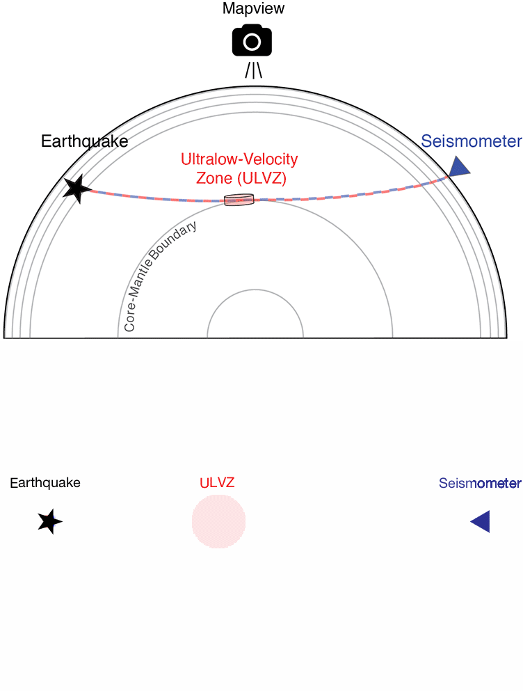 Les données sismiques permettent en effet aux géophysiciens de sonder la structure interne de la Terre, hors de portée des méthodes directes d’exploration géologique. Pour cela, ils ont recours à la tomographie sismique, technique reposant sur le même principe que le scanneur. Les ondes émises lors des grands séismes, enregistrées par un réseau mondial de sismographes, sont porteuses d’informations : leur vitesse de propagation et leur diffraction informent sur les discontinuités géologiques de la Terre (voir animation ci-dessous). L’idée est ensuite d’identifier les ondes sismiques ayant un comportement inhabituel par rapport à un modèle géologique homogène. « Les « formes d’onde » (l’allure de l’onde sur le sismogramme, NDLR) qui ne correspondent pas à ce que l’on connaît déjà de la composition terrestre vont révéler des structures encore inconnues », explique Barbara Romanowicz, sismologue et géophysicienne, professeure au Collège de France et à l'université de Californie, à Berkeley.