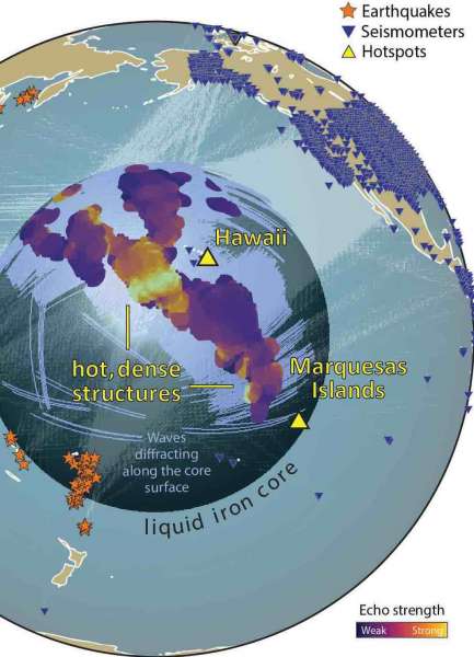 Les géophysiciens ont identifié de forts échos sous les Îles Marquises et sous Hawaï. Afin de déterminer leur origine physique, l’équipe a réalisé des simulations tridimensionnelles de propagation d’onde en laboratoire. Ils sont partis de plusieurs modèles de structures, avec des paramètres définis (de taille, de vitesse ou encore de densité), et ont fait varier ces paramètres pour trouver le modèle correspondant le mieux à l’amplitude et au temps de retard des échos observés. Résultats : ceux enregistrés sous Hawaï pourraient être produits par une très grande ULVZ – bien plus grande que celle documentée en 2012 -, ou par un conduit de panache. Quant aux échos détectés sous les Îles Marquises, ils correspondraient à la présence d’une ULVZ réduisant de 20 % la vitesse des ondes de cisaillement.
