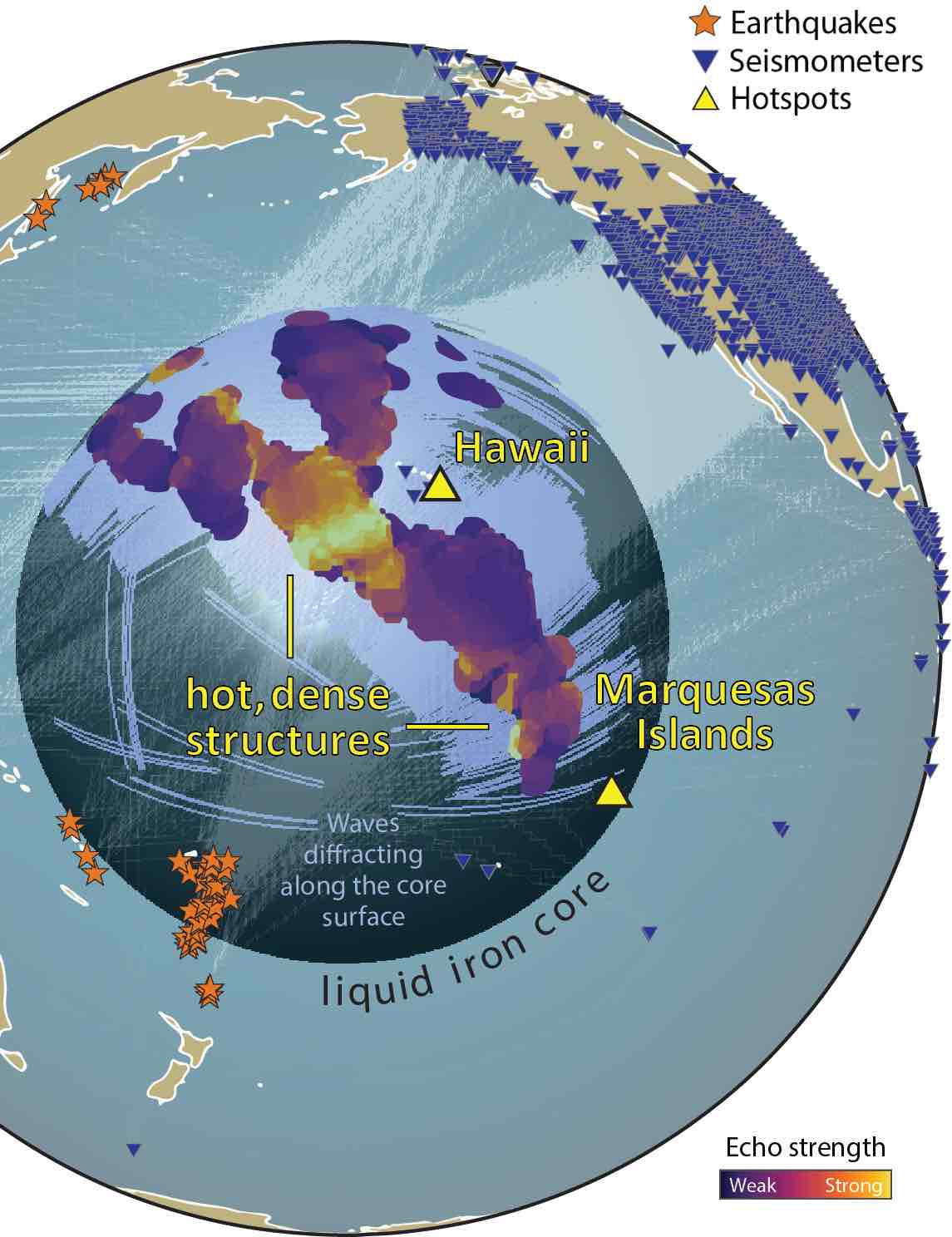 Les ondes sismiques traversant des structures anormales sont ralenties et laissent un signal supplémentaire, appelé postcurseur, faisant écho aux structures. « Les ondes diffusées par des hétérogénéités de cette région arrivent après l’onde Sdiff principale, et cet écho est porteur d'une riche information. Imaginez que vous soyez dehors dans l'obscurité : si vous tapez dans vos mains, puis entendez un écho, vous saurez qu'un grand mur ou une structure verticale se trouve devant vous. C'est ainsi que les chauves-souris écholocalisent leur environnement, rappelle Doyeon Kim. Avec ce principe, nous pouvons utiliser les échos des ondes de volume pour en savoir plus sur ces structures internes anormales. » L'amplitude et le moment d’apparition de ces postcurseurs peuvent révéler l'emplacement et la nature des structures non répertoriées. Et pour éviter que l’énergie réfléchie par la surface complique l'identification de ces échos, Doyeon Kim et son équipe se sont limités à des séismes profonds de plus de 200 km, d’une magnitude minimum de 6,5.