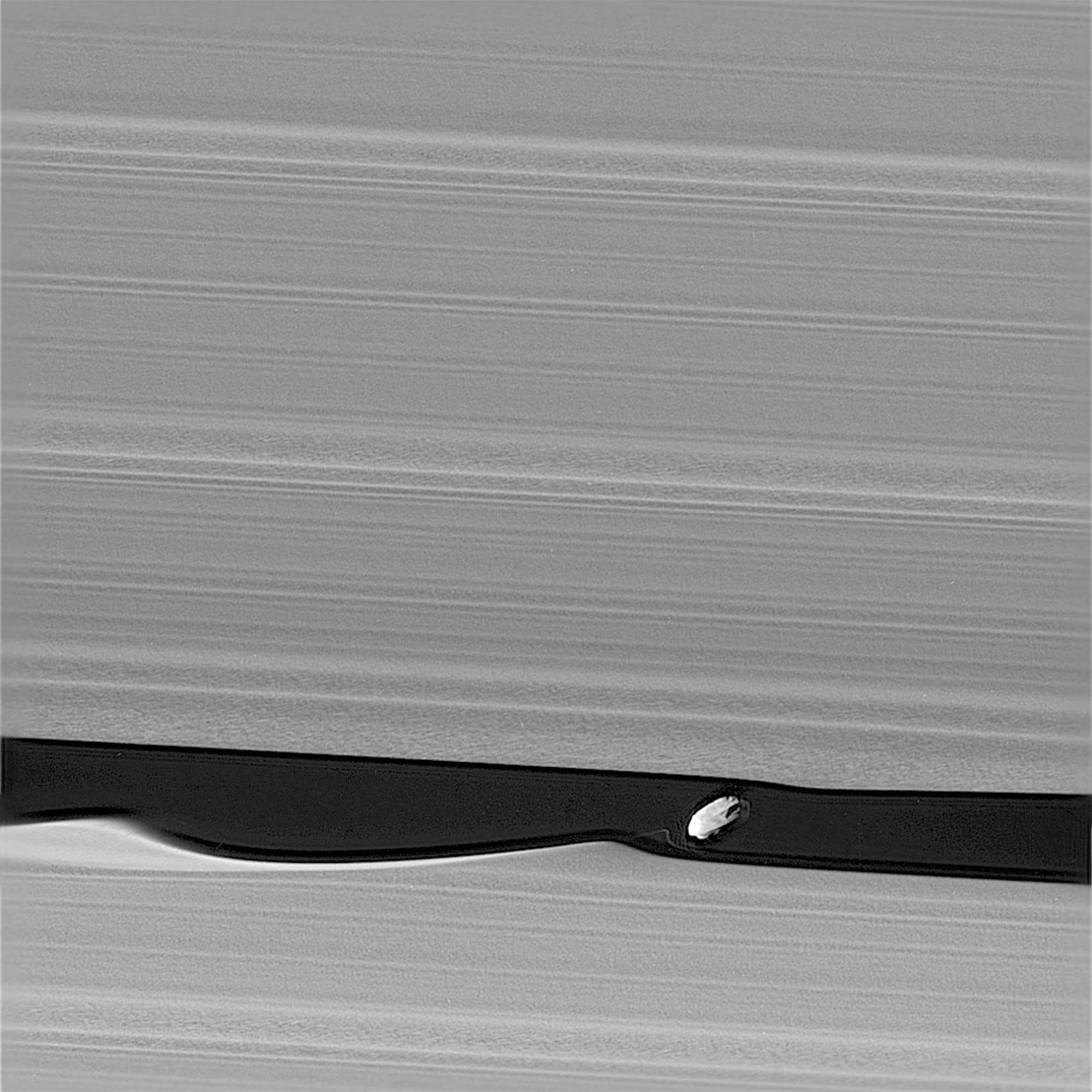 Petit satellite de Saturne de 9 kilomètres de long, Daphnis est ici pris en flagrant délit de perturbation des anneaux. Il faut dire que son orbite, à l'intérieur de ces anneaux, le fait passer à proximité des poussières et morceaux de glace qui les composent, créant une onde qui se propage à mesure qu'il tourne. Ce cliché a été pris le 16 janvier 2017 par la sonde américaine Cassini, qui explore le système saturnien depuis 2004 et qui nous a tant appris à son sujet. Mais la mission se termine et les dernières manoeuvres ont débuté. Au programme, des orbites rasantes en vue d'obtenir des images d'une résolution inégalée des anneaux telles que celle-ci. Le bouquet final sera une plongée au coeur de la planète géante en septembre 2017. Un chant du cygne qui sera riche d'enseignements sur l'atmosphère et la structure interne de la planète.