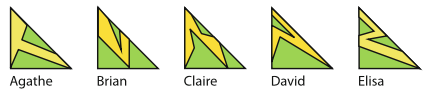 Puis, à l'aide d'une paire de ciseaux, chacun découpe le triangle ainsi obtenu en retirant certaines parties, indiquées en vert sur le dessin sous lequel son nom est indiqué.