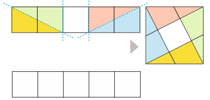 Une bande formée de cinq carrés de carton se découpe facilement, en quatre coups de ciseaux, pour se rassembler en un carré.