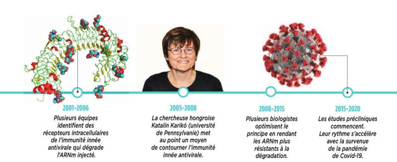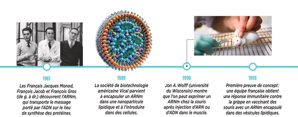 En 1990, une équipe de l'université du Wisconsin, aux États-Unis, parvient à faire exprimer des protéines exogènes in vivo, chez des souris, en injectant l'information génétique les codant sous forme d'ADN ou d'ARN. Deux ans plus tard, une équipe de l'université du Texas, aux États-Unis, obtient, chez des souris là encore, des réponses immunitaires spécifiques contre un antigène codé par une séquence d'ADN. Quelques mois plus tard, en 1993, une équipe française [incluant Frédéric Martinon, l'un des auteurs de cet article] induit des réponses immunitaires contre le virus de la grippe en vaccinant des souris avec un ARNm encapsulé dans des nanoparticules lipidiques, nommées « liposomes » (1). Cette expérience permet ainsi d'établir la « preuve de concept » du vaccin à ARN.
