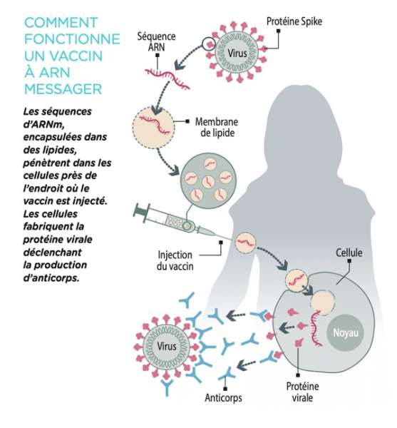 Comment fabrique-t-on un vaccin à ARNm ? On crée in vitro des séquences d'ARNm qui codent ces protéines. Puis on encapsule ces séquences dans des liposomes d'environ 80 nanomètres de diamètre. Après l'injection du vaccin, ces liposomes atteignent le cytoplasme des cellules, qui produisent alors les antigènes correspondants. Ces derniers sont ensuite présentés aux cellules immunitaires impliquées dans la réponse immunitaire adaptative pour qu'elles apprennent à les reconnaître (lire l'encadré p. 78).