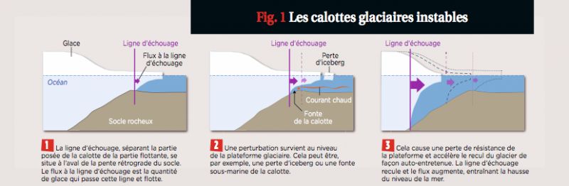 Le premier est induit par la topographie du sol rocheux qui se situe sous la glace dans la zone d'échouage. En effet, pour être stable, la ligne d'échouage ne peut pas se situer durablement sur des pentes ascendantes dans le sens de l'écoulement du glacier. Or de nombreux glaciers ont leur ligne d'échouage située juste au sommet de telles pentes, et il suffit d'une petite perturbation pour que la ligne recule. Cela peut être une diminution de la capacité de la plateforme à contenir l'écoulement des glaciers en amont. C'est le cas dès qu'elles perdent de la glace dans une zone qui n'est pas « passive », soit par un vêlage d'iceberg, soit par la fonte qui se produit dans les cavités, entre le fond marin et le plafond de glace des plateformes - un phénomène qui augmente avec la température de l'océan. Lorsque la capacité de résistance des plateformes de glace flottantes diminue, les glaciers en amont accélèrent et leur ligne d'échouage recule. Or, dans certains cas, cette dernière se trouve juste avant le sommet d'un relief. Si elle recule assez pour passer ce sommet et se retrouver dans la pente, elle va se mettre à reculer de façon auto-entretenue jusqu'à ce qu'elle arrive sur un relief descendant (dans le sens de l'écoulement). Le retrait de la ligne d'échouage entraînant une diminution de la partie posée de la calotte, le niveau de la mer va donc augmenter. Ce processus, envisagé au début des années 1970, a depuis été confirmé théoriquement, puis grâce à la modélisation numérique (Fig. 1).
