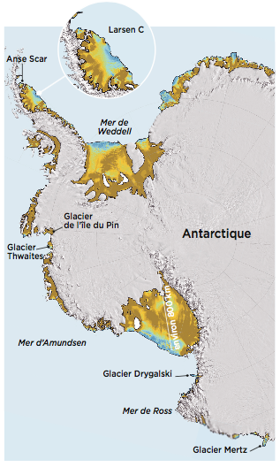 Entre le 10 et le 12 juillet, un énorme morceau de glace, à peine plus petit que la Corse, s'est détaché de la plateforme de glace flottante Larsen C située dans la péninsule Antarctique. Un phénomène qui vient renforcer les inquiétudes autour du devenir de cette immense réserve d'eau douce dans un monde qui se réchauffe. Quelle sera l'influence de cet événement sur son avenir à court, moyen et long termes ? Telle est la question à laquelle les scientifiques tentent de répondre. Il y a de quoi s'inquiéter : la fonte totale de l'Antarctique ferait monter le niveau des océans d'environ 60 mètres ! C'est le continent de tous les extrêmes : les plus basses températures enregistrées à la surface du globe (-92 °C, mesurée au centre du plateau de l'Antarctique de l'Est), les plus fortes épaisseurs de glace (qui peuvent atteindre 4 kilomètres), la plus faible densité de population (pas d'habitant permanent) ou les plus faibles précipitations, ce qui en fait le plus grand désert du monde. À la surface, ces faibles précipitations neigeuses viennent nourrir l'énorme masse de glace qui s'écoule très lentement sur son socle, du centre vers les bords. Lorsqu'elle atteint ces bords et franchit le portail de la ligne d'échouage - qui sépare la partie posée de la partie flottante de la calotte -, elle se met à flotter sur l'océan. Elle contribue alors à modifier le niveau des mers. La perte de glace se fait par vêlage (*) d'icebergs, de tailles souvent moins spectaculaires que pour celui venant de se produire à Larsen C.