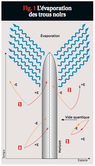 Jean est rassuré. Il parvient à récupérer en effet son ordinateur ainsi que le fichier de son roman en suivant les instructions de Pierre. Mais un mois plus tard, il laisse par mégarde tomber son ordinateur dans un trou noir. C'est fichu, se dit-il. Cette fois, il n'a plus aucun moyen de récupérer ses fichiers : le théorème de calvitie (*) stipule en effet que l'information est irrémédiablement perdue pour tout observateur extérieur au trou noir ; et s'il va chercher ses fichiers à l'intérieur, il sera détruit avec eux dans la singularité centrale. Son ami Pierre lui rappelle alors que, selon une découverte théorique faite en 1975 par le physicien britannique Stephen Hawking, s'il attend suffisamment longtemps à l'extérieur, le trou noir finira par s'évaporer, rayonnant toute sa masse sous forme de photons et autres particules (le rayonnement de Hawking) (Fig. 1). Jean, qui vient justement de lire le fameux livre de Hawking Une brève histoire du temps, rétorque que l'information récupérée dans le rayonnement du corps noir est tellement dégradée qu'elle est inutilisable. Son roman est bel et bien perdu ! Pas si sûr, argumente Pierre. Si l'information était vraiment perdue, la mécanique quantique ne serait plus valable. Celle-ci assure en effet la microréversibilité ainsi que la conservation de l'énergie qui va avec. Si le trou noir violait la première, il violerait la seconde, et en engloutissant à jamais les informations, il devrait produire d'énormes quantités d'énergie qui échaufferaient l'Univers en une fraction de seconde.