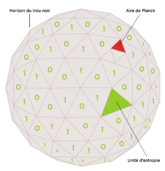 Du point de vue de l'information, chaque bit sous forme de 0 ou de 1 correspondrait à quatre aires de Planck, ce qui permet de retrouver la formule de Bekenstein-Hawking reliant l'entropie à l'aire du trou noir (S = A/4). Tout se passe donc comme si l'information perdue pour un observateur extérieur - l'entropie du trou noir -, portée initialement par la structure 3D des objets ayant traversé l'horizon des événements, était codée sur sa surface 2D, un peu à la façon dont un hologramme code l'information tridimensionnelle sur une surface.