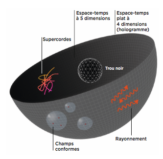 Confrontés à la difficulté d'appliquer le principe holographique à un modèle d'univers réaliste (les solutions cosmologiques standards, dites de Friedmann-Lemaître, n'ont pas de frontière), les physiciens se sont tournés vers des modèles d'univers simplifiés dans lesquels le principe pourrait s'appliquer. La première réalisation concrète a été l'oeuvre du théoricien argentin Juan Maldacena qui, en novembre 1997, publia un résultat étonnant assorti d'une audacieuse conjecture mathématique. Considérant un trou noir dans un modèle d'espace-temps à cinq dimensions macroscopiques caractérisé par une géométrie dite anti de Sitter, il montra que les détails des phénomènes se déroulant dans cet univers, décrits par la théorie des cordes et incluant donc la gravitation, étaient entièrement codés dans le comportement de certains champs quantiques (non gravitationnels) se déroulant sur la frontière quadridimensionnelle de cet univers.