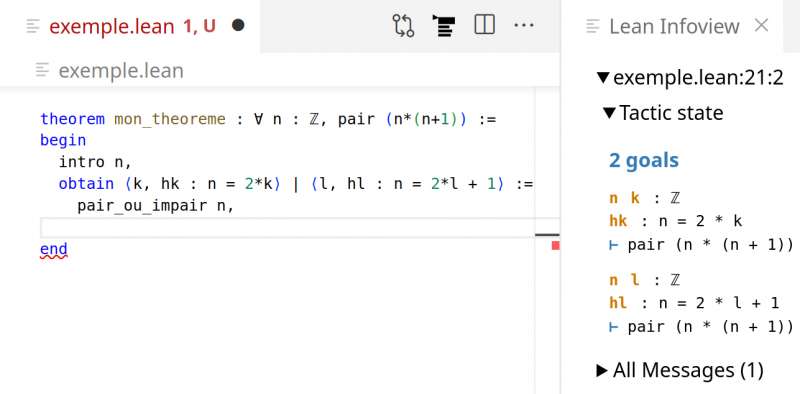 Travailler avec un logiciel comme Lean ou Coq consiste en une interaction permanente entre l'humain et la machine. Un exemple simple avec Lean.