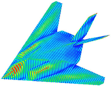 Image d'ouverture : Cette simulation montre les couleurs codant l'intensité des courants induits sur la surface d'un avion par les champs incidents (rouge : intensité la plus forte). Ces courants rayonnent un champ électromagnétique diffracté qui est la signature radar (crédit : CEA)