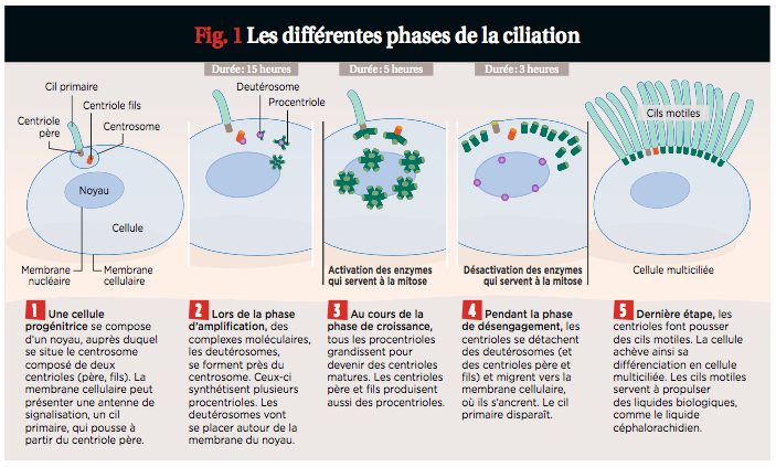 Dans la première phase, les centrioles se multiplient. Les petits centrioles immatures se rassemblent par paquets de cinq autour d'une structure protéique appelée deutérosome. Au total, ils sont plus d'une centaine. La deuxième phase commence alors : les centrioles, disposés autour de leur deutérosome, lui-même collé au noyau de la cellule, s'allongent et grossissent. Enfin, lors de la troisième phase, ils se séparent du deutérosome et se dirigent vers la membrane, où ils vont se planter et constituer le germe des cils. Ce qui frappe le plus dans les vidéos obtenues, c'est la synchronisation de tous les éléments au cours de chaque étape et la netteté des transitions entre les unes et les autres : les images montrent une centaine de centrioles qui s'allongent en même temps, puis se détachent à l'unisson, comme une vague.
