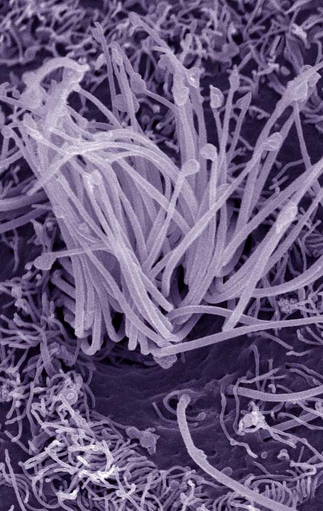 Photo : De longs cils mobiles sont visibles à la surface de la membrane de cette cellule multiciliée cérébrale. Ces cellules possèdent de 50 à 300 cils. © Adel Al Jord