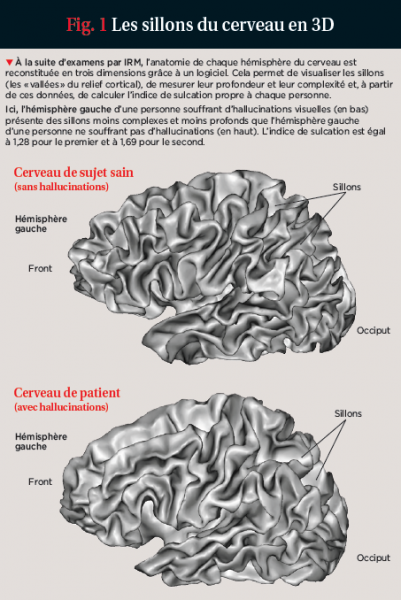 Pas question cependant de comparer tous les sillons un à un pour répondre à la question posée. Non seulement le travail serait fastidieux mais, lorsqu'on ne sait pas où regarder, les chances d'y parvenir sont minimes ! L'équipe entreprend plutôt de quantifier les plissements des hémisphères de chacun des groupes. Elle utilise pour cela une mesure, « l'indice de sulcation », mise au point en 2008 par Arnaud Cachia afin de quantifier l'enfouissement des sillons et leur degré de complexité. La thèse en imagerie du chercheur lui permet en effet de mettre ses compétences méthodologiques au profit de sa recherche fondamentale. Les résultats révèlent que la quantité de plissements est plus faible chez les personnes souffrant de schizophrénie que chez les non-malades, confirmant de précédents résultats. Et qu'elle est plus faible encore chez les patients atteints d'hallucinations visuelles.