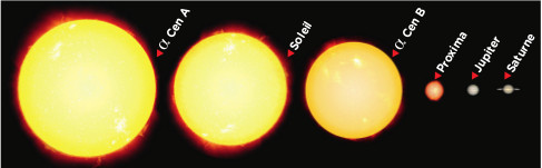Comme le montre cette comparaison des tailles des étoiles étudiées, alors que Alpha Centauri A et B (α Cen A et α Cen B) sont similaires au Soleil (à 10% près), Proxima est une naine rouge. Plus petite que les anneaux de Saturne, elle a moins de deux millièmes de la luminosité du Soleil. © Pierre Kervella / NASA-ESA-HST (STSCI/AURA) - NAS/SDO