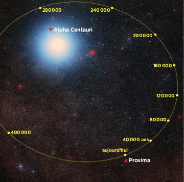 Connaissant la vitesse de Proxima et sa position dans le ciel, nous avons aussi pu calculer son orbite : elle effectue une révolution autour d'Alpha Centauri en 550 000 ans. C'est la plus longue période orbitale connue pour un système multiple d'étoiles. Projetée sur le ciel, la trajectoire de Proxima présente ainsi une très grande taille angulaire de plus de trois degrés, soit environ la largeur apparente de deux doigts, bras tendu. Ce mois-ci, le satellite européen Gaia donnera une mesure très précise de la distance et du mouvement propre de Proxima, ce qui permettra d'affiner encore davantage son orbite.