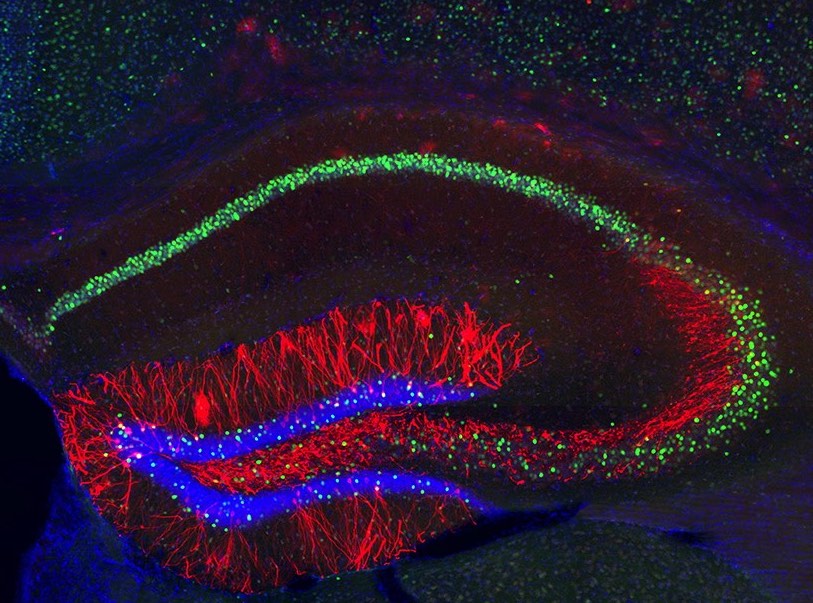 Légende image : Des neuroscientifiques du MIT, aux États-Unis, ont implanté de faux souvenirs dans le cerveau d'une souris en agissant sur certaines cellules de l'hippocampe (en rouge) impliquées dans la mémoire.