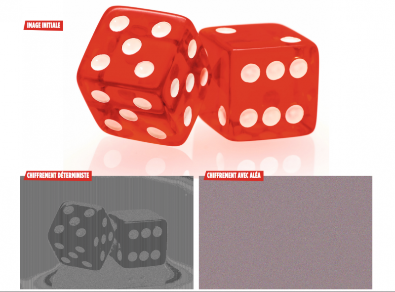 Photo : Pour cacher une image avant de la transmettre, on la transforme par cryptographie. Si l'on chiffre les pixels individuellement de manière déterministe, ce n'est pas efficace et de l'information transparaît. En ajoutant de l'aléa dans le chiffrement, l'image de départ est brouillée © Damien Vergnaud