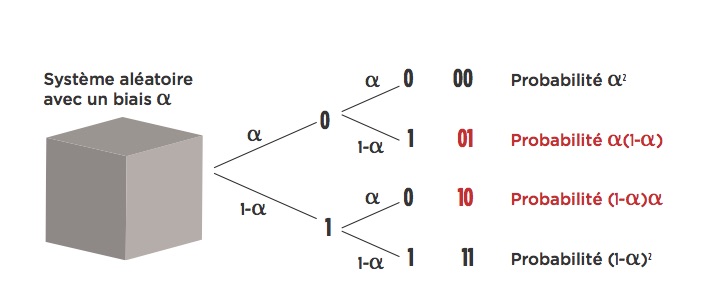 Comment extraire un hasard uniforme si on dispose d'un système qui produit des bits un par un, mais avec un biais ? Supposons par exemple que le bit 0 apparaît avec une probabilité alpha et le bit 1 avec la probabilité 1-alpha. Même en ne connaissant pas la valeur du biais , il est possible de produire une suite de bits aléatoires uniformément. En effet, chaque paire de bits 01 et 10 apparaît alors avec exactement la même probabilité, puisque alpha(1-alpha) est égal à (1-alpha)alpha. Il suffit alors de garder ces paires (en disant, par exemple, que 01 représente le bit 0 et 10 représente le bit 1) et de supprimer les autres pour avoir, en itérant ce processus, une succession de bits aléatoires uniformément répartis. Il existe de nombreux extracteurs d'aléas qui raffinent ce procédé.