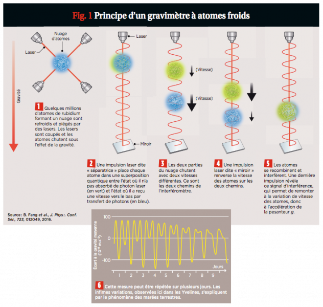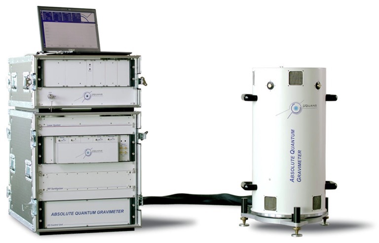 La mesure de gravité, ou gravimétrie, est indispensable aux géophysiciens : la mesure de l'accélération de la pesanteur et de ses variations spatio-temporelles renseigne en effet sur la répartition des masses au sein de la Terre. Une variation de densité dans le sous-sol, associée par exemple à la présence d'eau ou d'hydrocarbures, peut induire une variation relative de l'accélération de la pesanteur locale de l'ordre de 10-9. Détecter des variations aussi infimes suppose que l'instrument utilisé ne dérive pas de lui-même sur l'échelle de temps de la mesure. Sur cet aspect en particulier, les gravimètres à atomes froids se distinguent des autres technologies, utilisant notamment des systèmes masse-ressort ingénieux sujets aux dérives en température, difficiles à contrôler à ces niveaux de stabilité. Après plus de vingt ans de recherches, ils sortent désormais du laboratoire pour des mesures de terrain ! Ainsi, avec le projet Girafe 2, l'Onera a effectué des mesures de gravité à bord d'un navire ; et un gravimètre atomique de la société Muquans va être installé au sommet de l'Etna pour surveiller son activité (lire encadré).