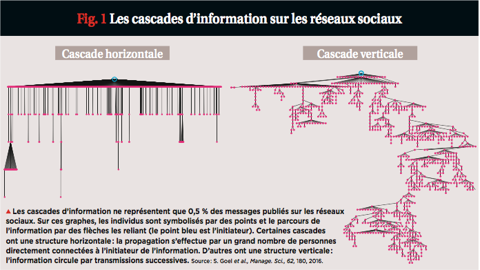 L'une des découvertes les plus marquantes de ces dernières années est que la structure d'une cascade est révélatrice du type d'information qu'elle véhicule. Une fake news, par exemple, ne se propage pas de la même façon qu'un fait avéré. En 2018, Sinan Aral, économiste et expert du « marketing viral » au Massachusetts Institute of Technology, et son équipe ont analysé un échantillon de 126 000 rumeurs et informations, propagées sur Twitter entre 2006 et 2017 par environ 3 millions de personnes de langue anglaise. Les rumeurs concernaient principalement la politique (45 000 d'entre elles), mais aussi le terrorisme, la science, les catastrophes naturelles ou l'économie. Ses résultats font froid dans le dos. Les fausses informations (en particulier les fake news politiques) engendrent des cascades pouvant impliquer jusqu'à 100 000 individus, tandis que les vraies peinent à dépasser les 1 000 personnes. Autres enseignements de cette étude : les fausses informations se propagent environ six fois plus rapidement que les vraies, circulent pendant des durées plus longues et ont des structures plus verticales .