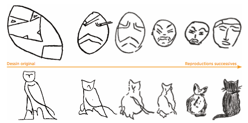 En 1931, le psychologue britannique Frederic Bartlett conduit une expérience semblable au jeu du téléphone. Le long d'une chaîne de transmission, ses participants doivent se faire passer un récit issu d'une ancienne légende d'Indiens d'Amérique. Résultat : l'histoire retransmise par les participants a tendance à se conformer progressivement à leur culture occidentale. Dans une autre expérience, visuelle cette fois, le psychologue examine comment se transforme un dessin lorsqu'il circule le long d'une chaîne de transmission. Là encore, il observe une distorsion : une représentation de masque africain devient un visage standardisé, un hiéroglyphe égyptien devient un chat. Ainsi, la déformation de l'information n'est pas aléatoire, mais reflète la culture et les préjugés des personnes qui la véhiculent.
