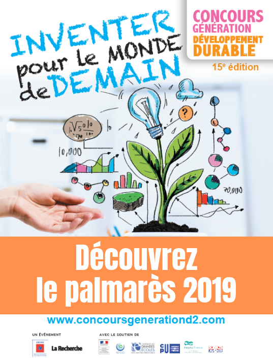 Le magazine La Recherche, l’ADEME, le Ministère de l'Enseignement supérieur et de la Recherche, la CGE, la CPU, le REFEDD, PEPITE France et le magazine Sciences & Avenir sont heureux de vous annoncer les lauréats du Concours Génération Développement Durable 2019.